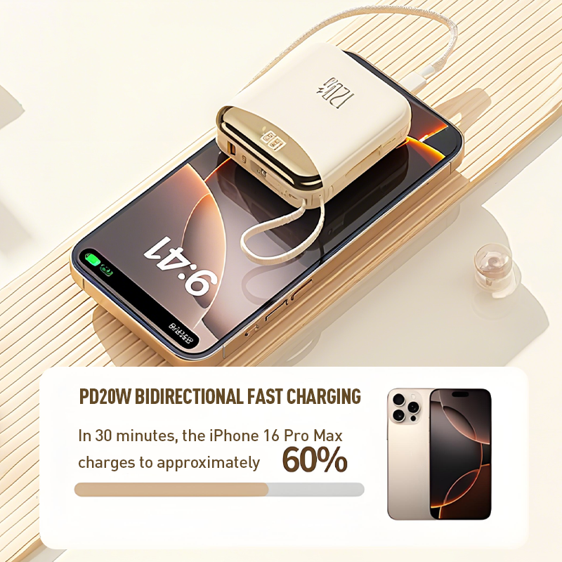 INTEGRATED DUAL-CABLE DESIGN – Say goodbye to the hassle of searching for charging cables. This power bank features USB-C and Lightning cables built directly into the body, offering instant compatibility with all mobile devices. Neatly stored cables eliminate clutter, ensuring you're always ready to go.