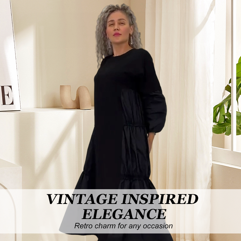 Featuring long sleeves and a graceful midi-length hem, this dress blends classic retro charm with modern sophistication. Thoughtful seam details enhance its refined silhouette for any occasion.