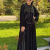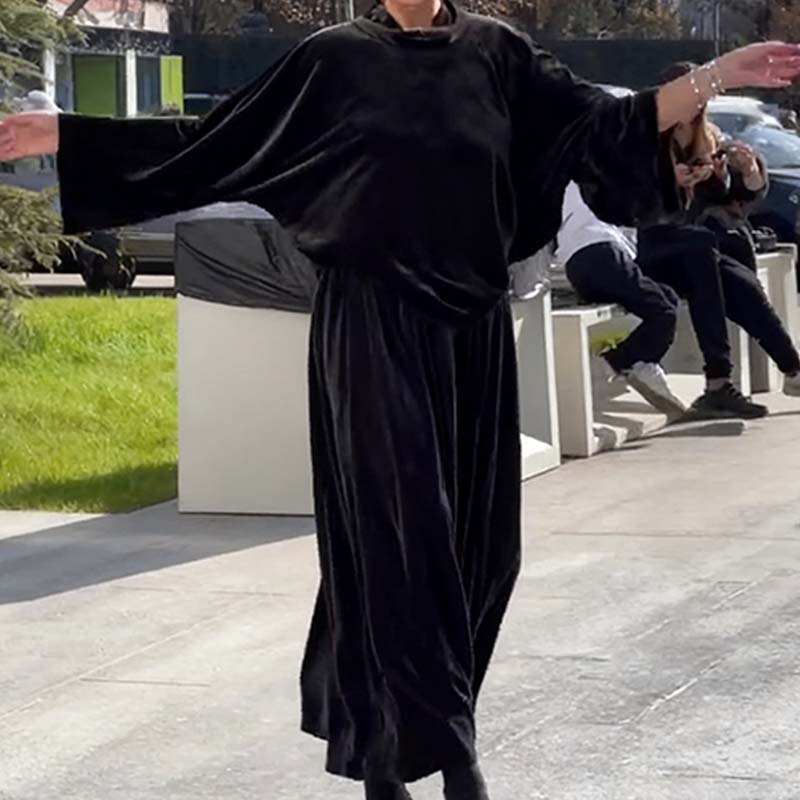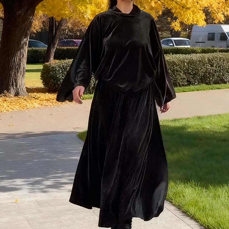 This black two-piece set presents refined sophistication. The top with wide sleeves pairs beautifully with a flowing skirt, creating an understated yet stylish silhouette suitable for various occasions, from casual outings to more elegant gatherings.