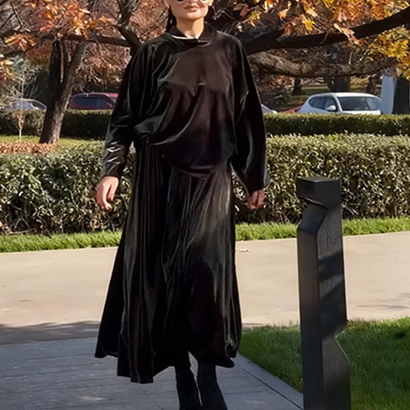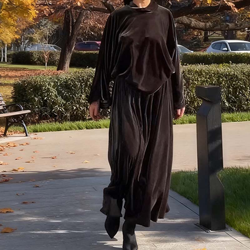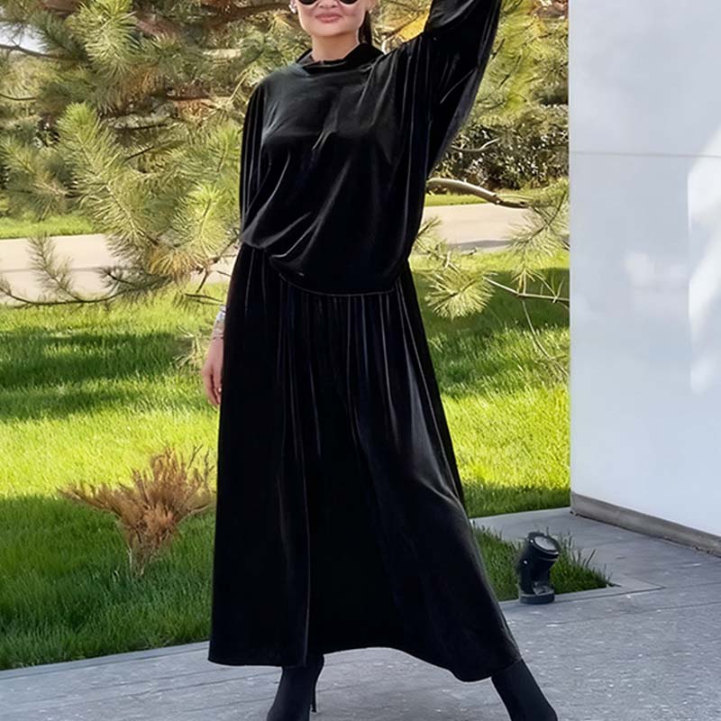 👗 Elegant Black Velvet Two-Piece Set – Flowing Top & Skirt for Effortless Sophistication